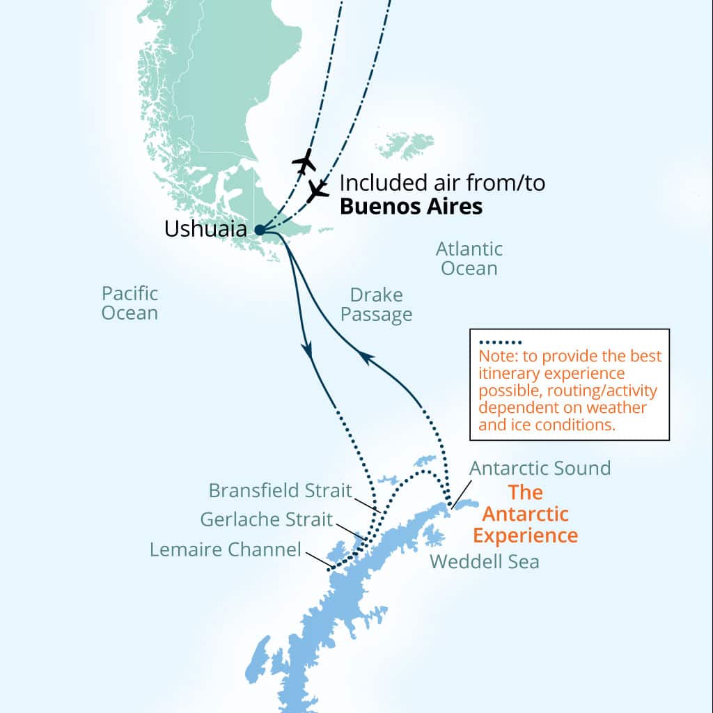 9 Night Cruise sailing from Ushuaia roundtrip aboard World Explorer. Hotel stay pre-cruise in Ushuaia.